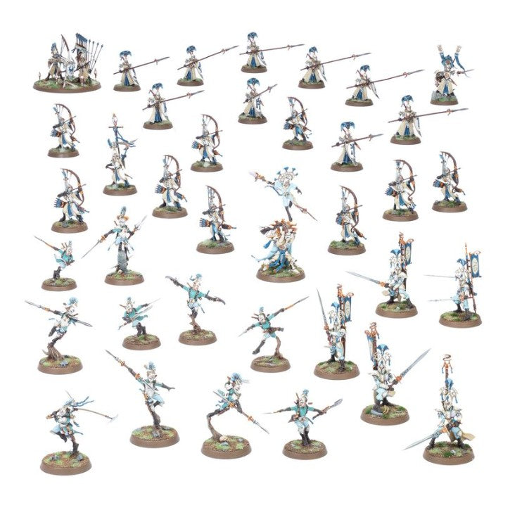 This loaded box is ideal for starting a new Lumineth Realm-lords collection – or expanding an existing army – to restore balance to the Mortal Realms in games of Warhammer Age of Sigmar, and save money compared to buying the kits separately. This large and balanced force is led by Ellania and Ellathor, legendary Eclipsian Warsages who offer magical might and martial prowess. The core of the force is composed of both Vanari Auralan Sentinels and Wardens, providing ranged offence and staunch defence. Supporting them is a unit of fast and slippery Ydrilan Riverblades to claim vital objectives in enemy territory. A unit of elite Vanari Bladelords is ready to take on the toughest enemy units, while a Vanari Starshard Ballista picks off high-value targets from a distance. This boxed set builds 37 multipart plastic Lumineth Realm-lords miniatures: 1x Ellania and Ellathor, Eclipsian Warsages 1x Vanari Starshard Ballista 5x Vanari Bladelords 10x Ydrilan Riverblades 10x Vanari Auralan Sentinels 10x Vanari Auralan Wardens The miniatures in this box are easy to customise. The Starshard Ballista can be assembled with a choice of two sets of arrows, and one of the crew can be built with both hands on the artillery piece or with a scryhawk. The Vanari Bladelords include parts to assemble either a male or female champion, armed with either a greatblade or dual blades, and a choice of two heads – helmeted or bare. The flexible Ydrilan Riverblades kit builds a champion armed with blades, darts, or a warglaive. One can be assembled with a roped sickle or dual blades, and another with a blade and dagger or dual curved blades. The Vanari Auralan Sentinels include parts to assemble an optional champion who can be built with a scryhawk, lantern, or empty left hand. The kit builds six male Sentinels with six interchangeable heads (in three designs) and four female Sentinels with four interchangeable heads (in two designs). The Vanari Auralan Wardens have parts to build up to two optional champions, of which one can be used in game. Each are armed with either a sword or rod of office in their hand, and have choice of two heads – one bare and one helmeted. There are six female heads (in three designs) that are interchangeable across the four female bodies (in two designs). There are also eight male heads (in four designs) that are interchangeable across the six male bodies (in three designs). The kit includes 20 shields (in 10 designs) that are interchangeable across the unit. This kit comprises 410 plastic components, 1x Citadel 80mm Round Base, 1x Citadel 40mm Round Base, 30x Citadel 32mm Round Bases, and 5x Citadel 28.5mm Round Bases. These miniatures require assembly and are supplied unpainted. This boxed set is only available while stocks last.