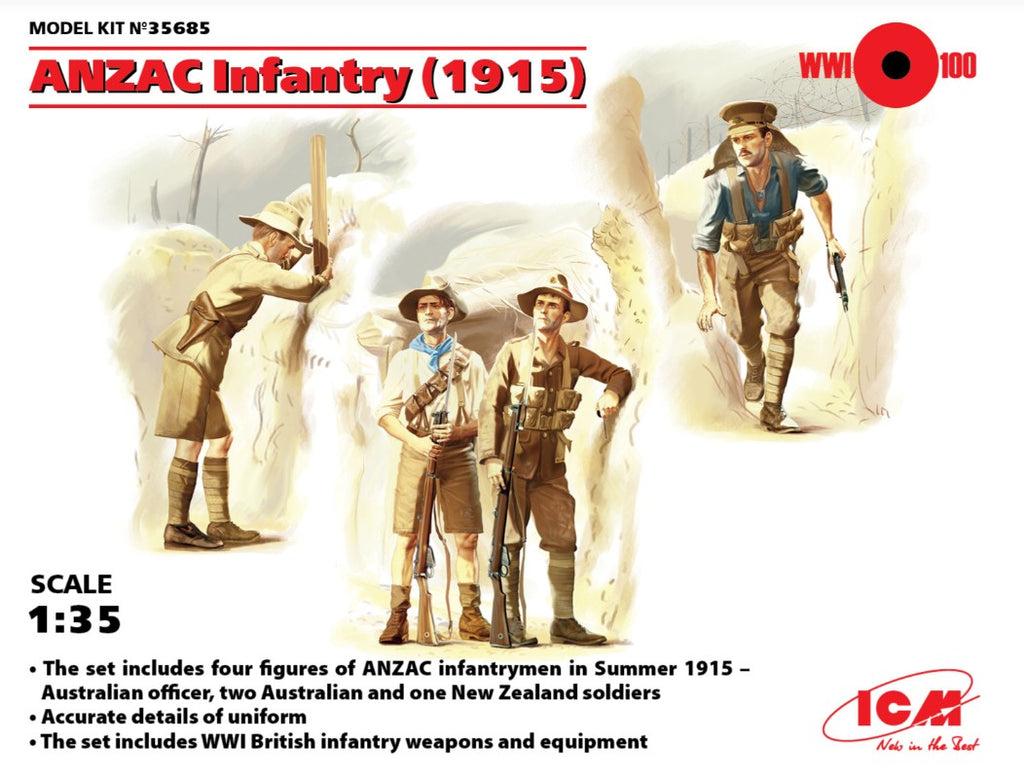 ICM35685 The set includes parts for assembly 4 figures of ANZAC Infantry of 1915 period.