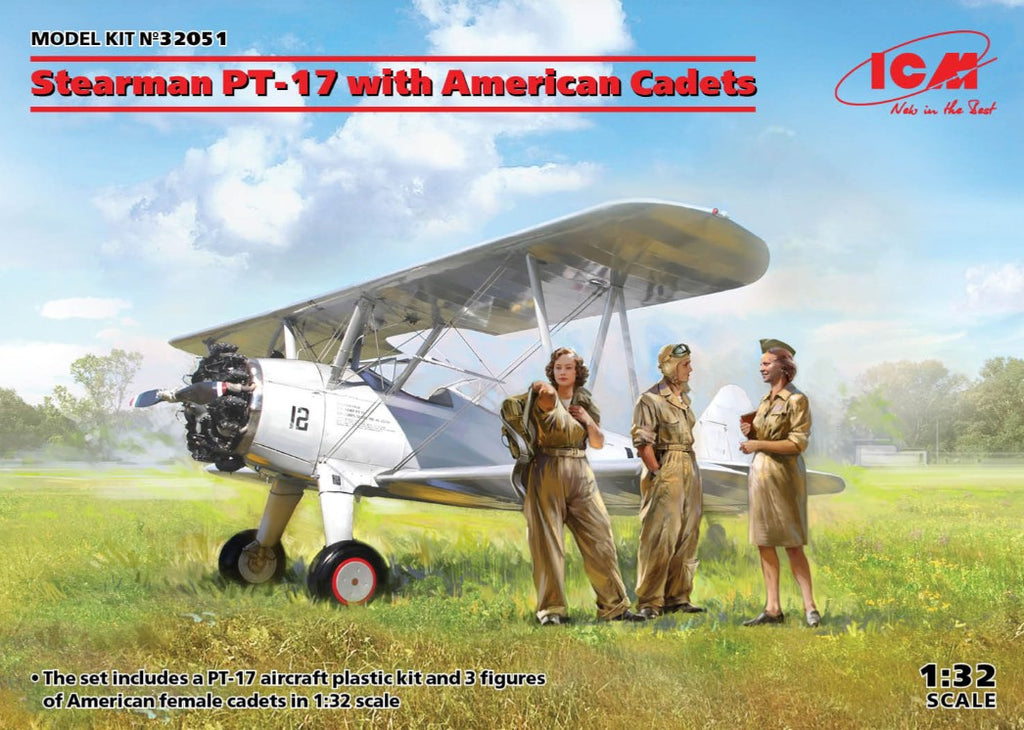 ICM32051 The set includes 92 parts for assembly of PT-17 aircraft plastic kit and 25 parts for assembly of 3 figures of American female cadets of 1943-1945 periods in 1:32 scale.
