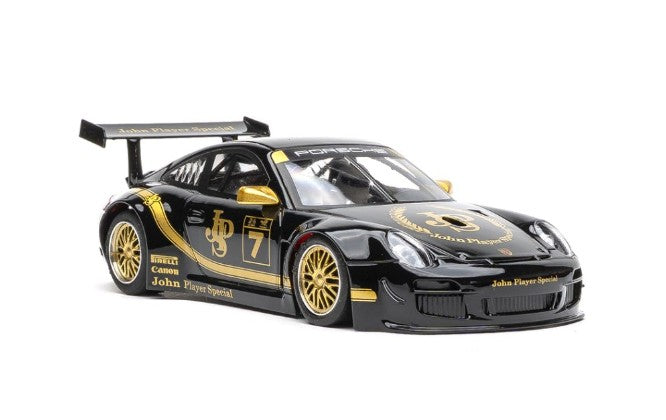 The Porsche 997 GT3 #7 John Player Special is a striking tribute to the legendary black and gold livery that has graced some of motorsport's most iconic machines. This 1:32 scale slot car, produced by NSR, captures the essence of racing heritage with modern performance engineering.