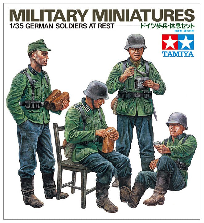 German infantry in the early stages of WWII were kitted out in the M36 uniform that was first introduced from 1935 to 1936. It was comprised of a green jacket and "stone gray" trousers, long black boots and topped off with the M35 helmet. The kit recreates four soldiers in relaxed pose, with food, drink, mess tins and more. This is a 1/35 scale plastic model assembly kit. Parts are included for 4 figures in relaxed pose. A wealth of accessories includes gas mask cases, chair, frying pan, sausage, mess tin and more.
