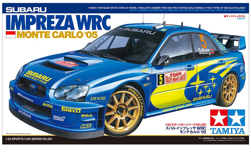 1/24 scale replica plastic model of the 2005 Monte Carlo Rally Subaru Impreza. Overall length: 183mm, width: 75mm, height: 57mm. Details unique to Monte Carlo vehicle all reproduced including lowered chassis for tarmac racing, straight lower arms, on-road Pirelli tires and wheels, and short antennas. Sectioned rear wing comes molded as one piece.